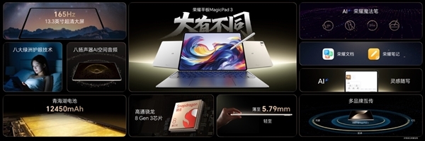 荣耀MagicPad3采用一体化全金属机身,超窄边框与极致轻薄设计,整体厚度5.79mm、重量595g,彰显高端质感,引入鎏光拓影工艺,可选月影白、浮光金及星空灰配色。