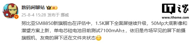 IT之家 8 月 4 日消息,博主 @数码闲聊站 今日曝光努比亚 SM8850(第二代骁龙 8 至尊版)新旗舰部分信息,预计为努比亚 Z80 Ultra。