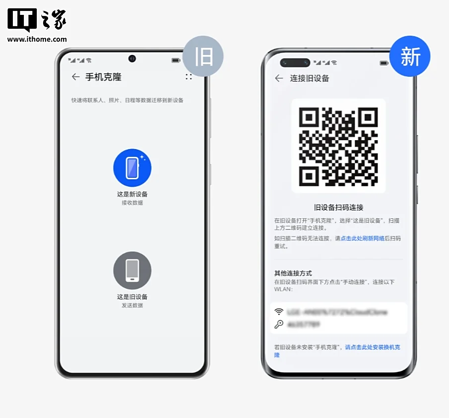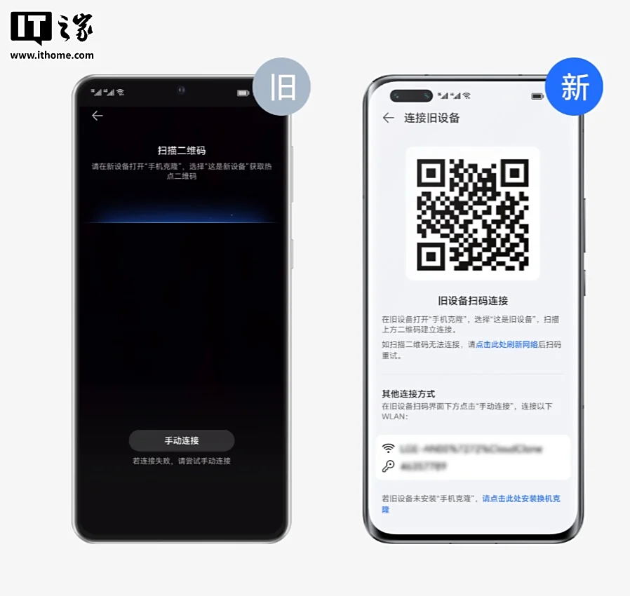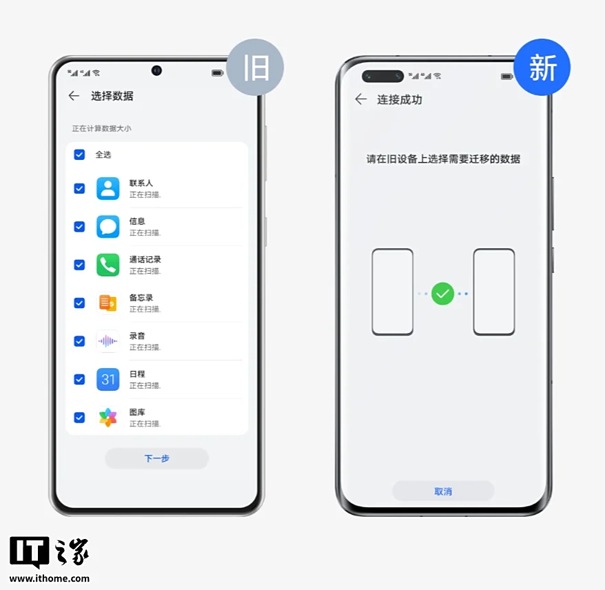• 用旧设备扫描新设备上的二维码,连接新旧手机。