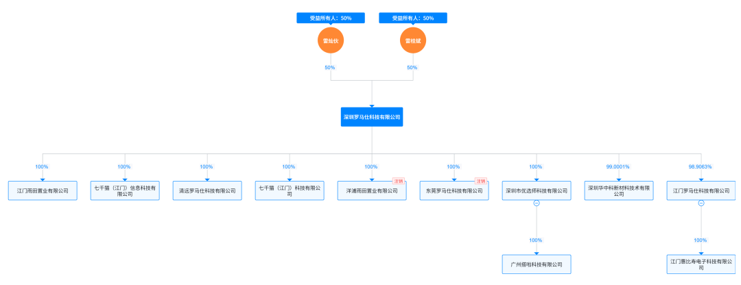 天眼查显示,罗马仕的实控人为雷灿伙和雷桂斌,两人各自拿着公司50%的股份。
