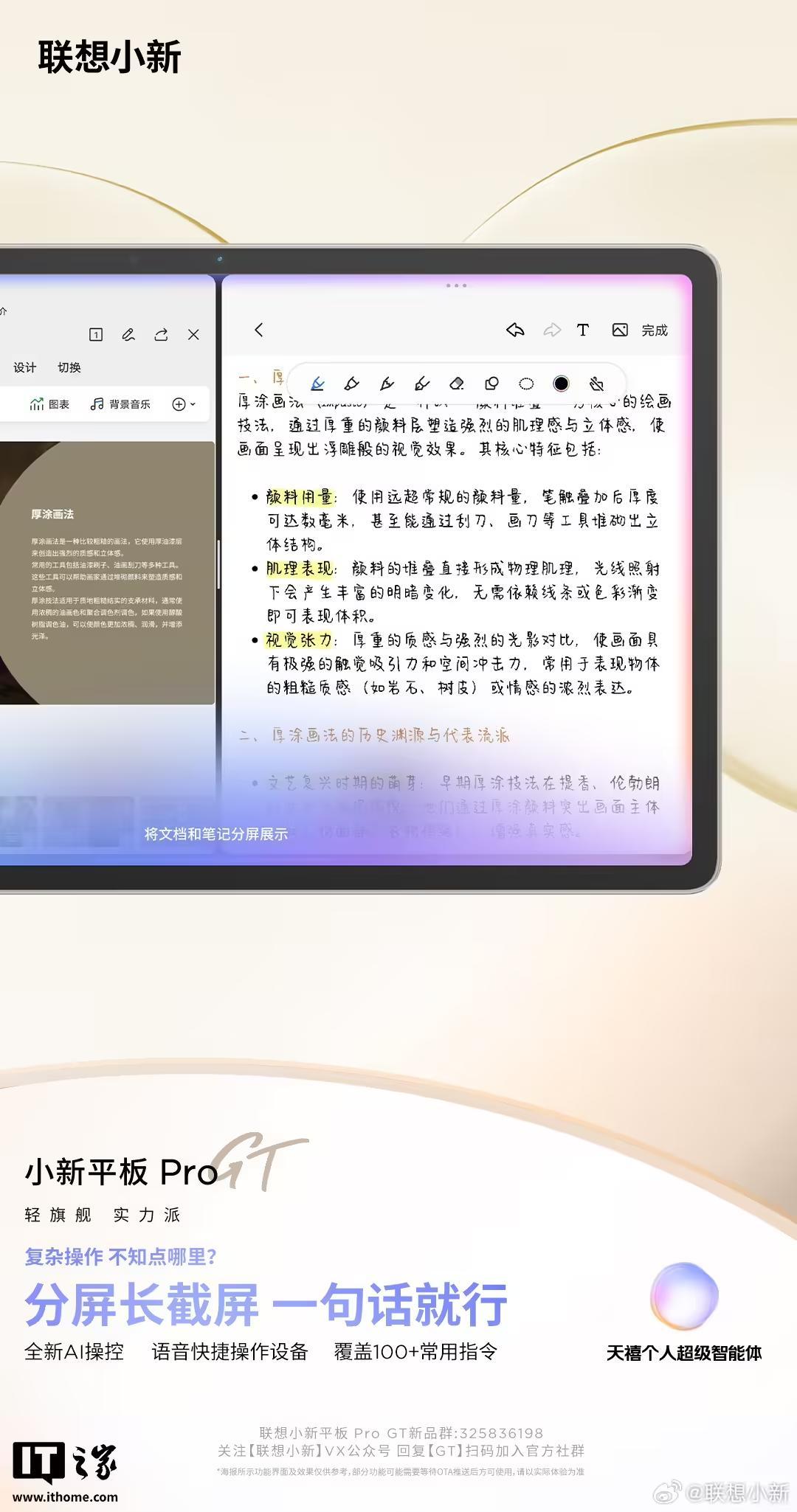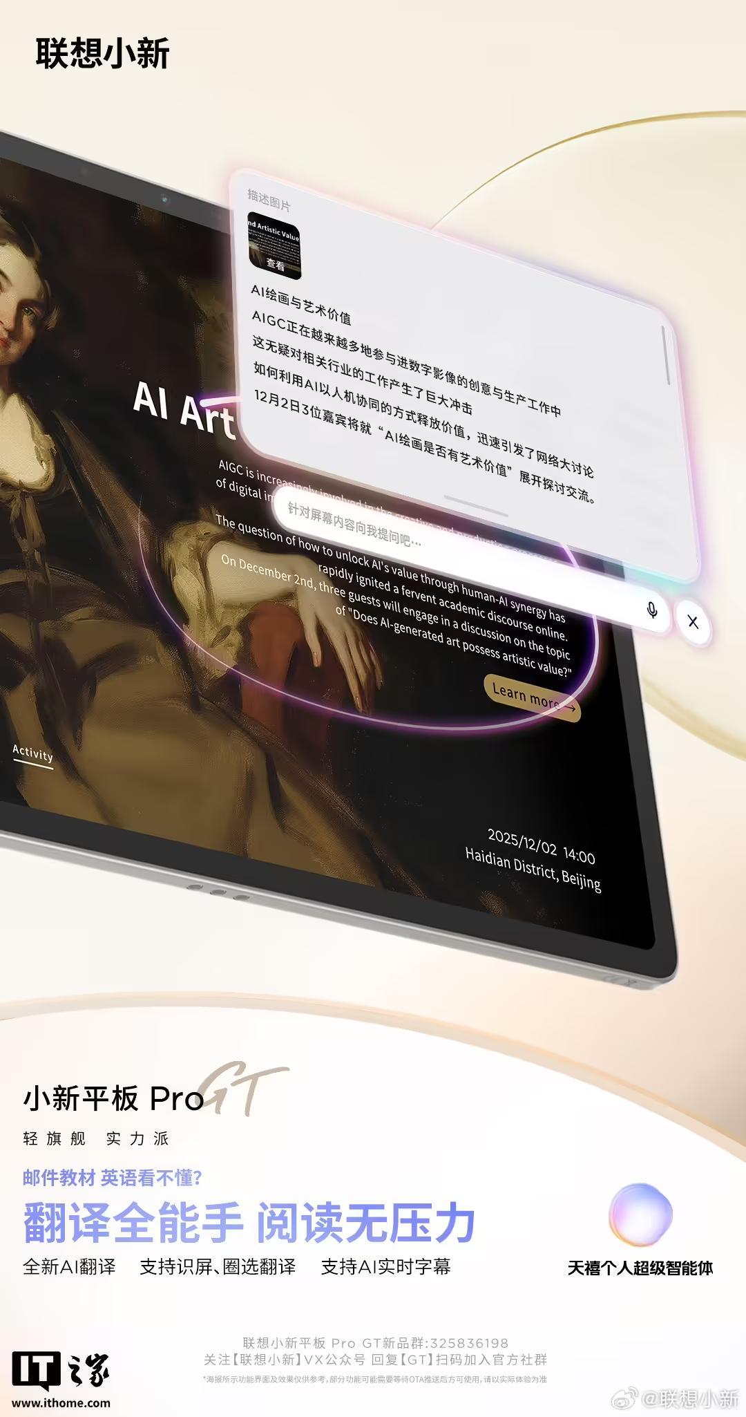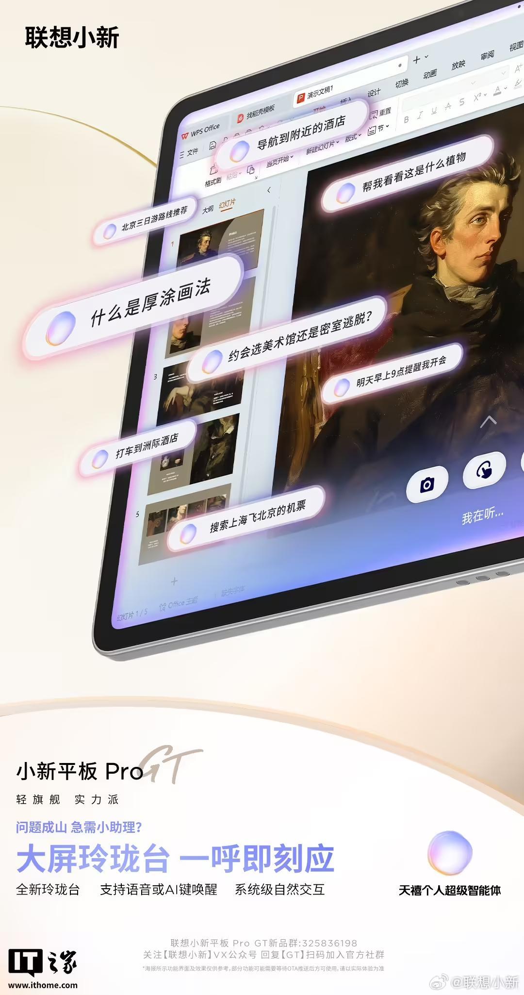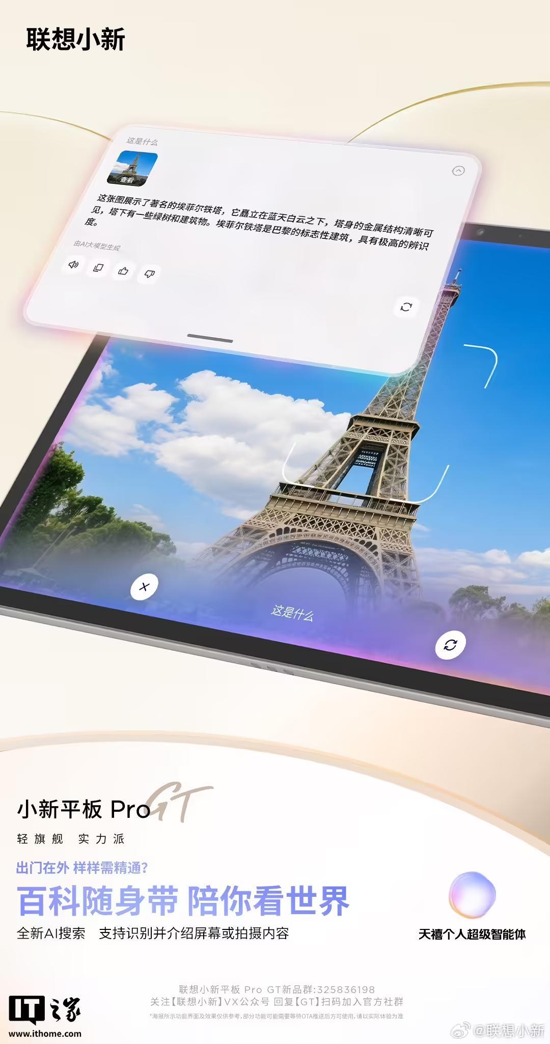 IT之家 7 月 10 日消息,联想小新昨日继续预热小新平板 Pro GT:新品首发搭载移动版全新天禧个人超级智能体,号称“开启平板 AI 交互新时代”。