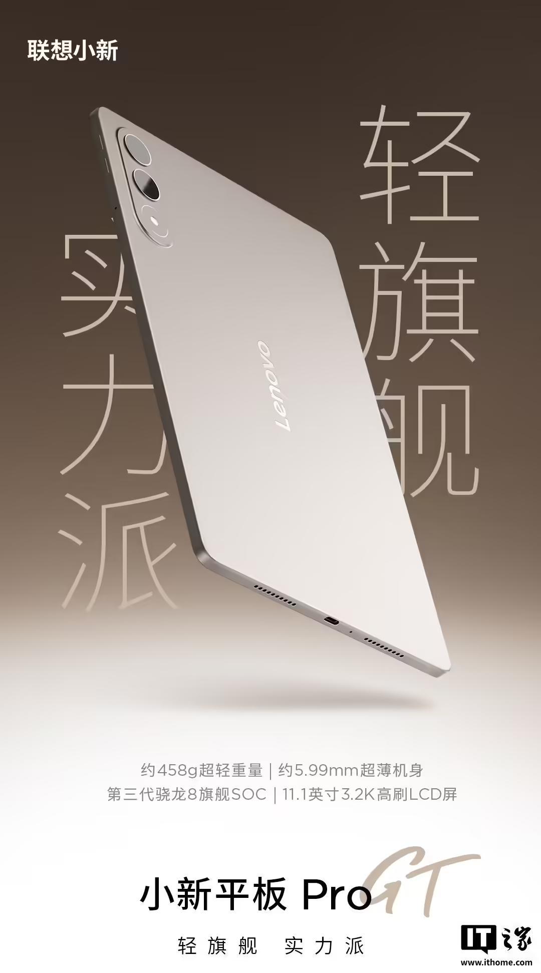 据IT之家此前报道,联想小新平板 Pro GT 已确认搭载第三代骁龙 8 旗舰 SOC、配备 11.1 英寸 3.2K 高刷 LCD 屏幕。新款平板还采用轻量化设计,拥有约 458g“超轻重量”和约 5.99mm“超薄机身”。
