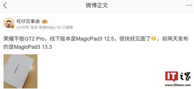 产品包装盒显示,荣耀平板 GT2 Pro 预装 MagicOS 系统(预计为 MagicOS 9.0 及以上版本),配备超 12 英寸屏幕(博主 @旺仔百事通 透露,荣耀平板 GT2 Pro,线下版本是 MagicPad3 12.5,前两天发布的是 MagicPad3 13.3),由此来看,新机将配备 12.5 英寸屏幕。