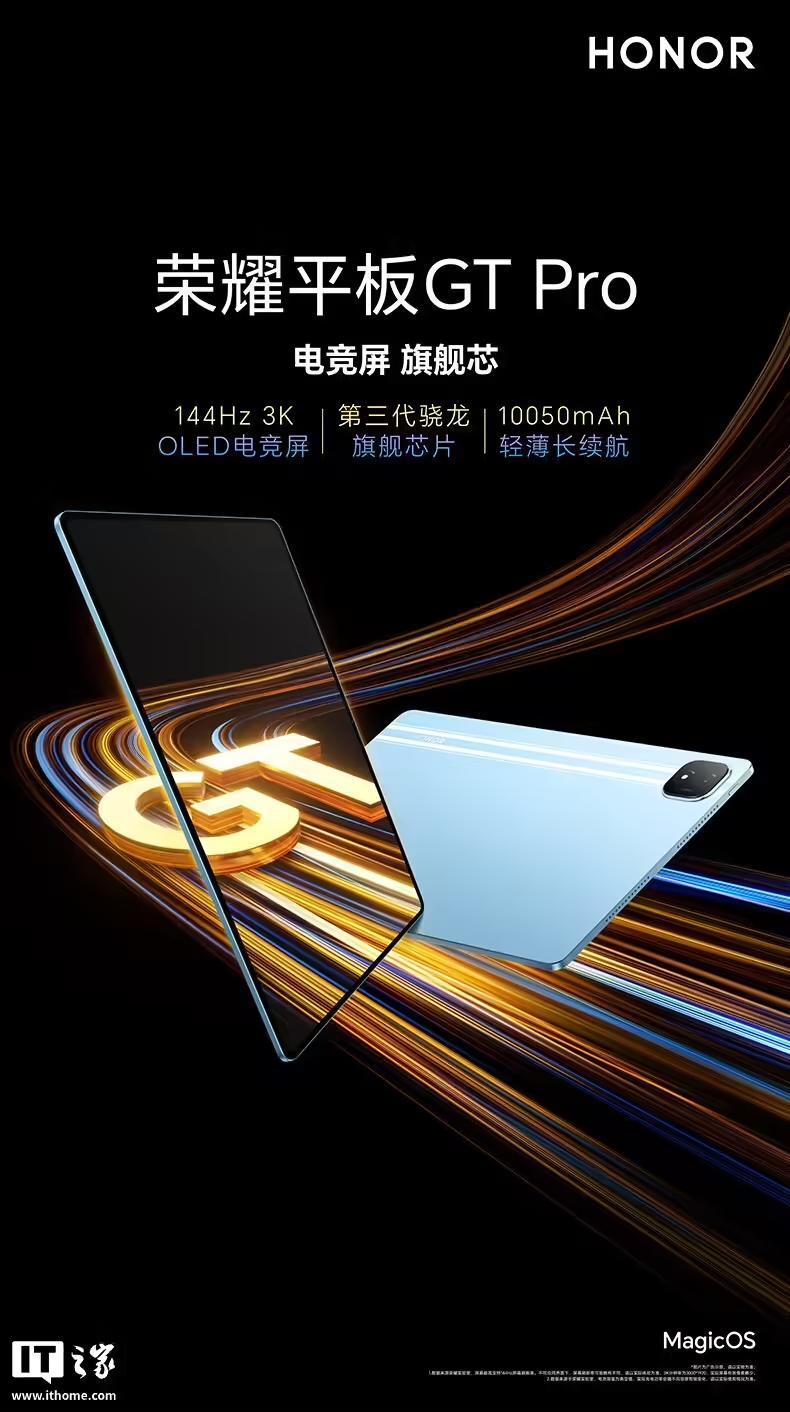 作为参考,荣耀去年 10 月发布了荣耀平板 GT Pro,其搭载骁龙 8s Gen3 处理器、配备 12.3 英寸 144Hz 3K(3000×1920) OLED 屏幕,官方售价 2499 元起。IT之家附主要参数如下:
