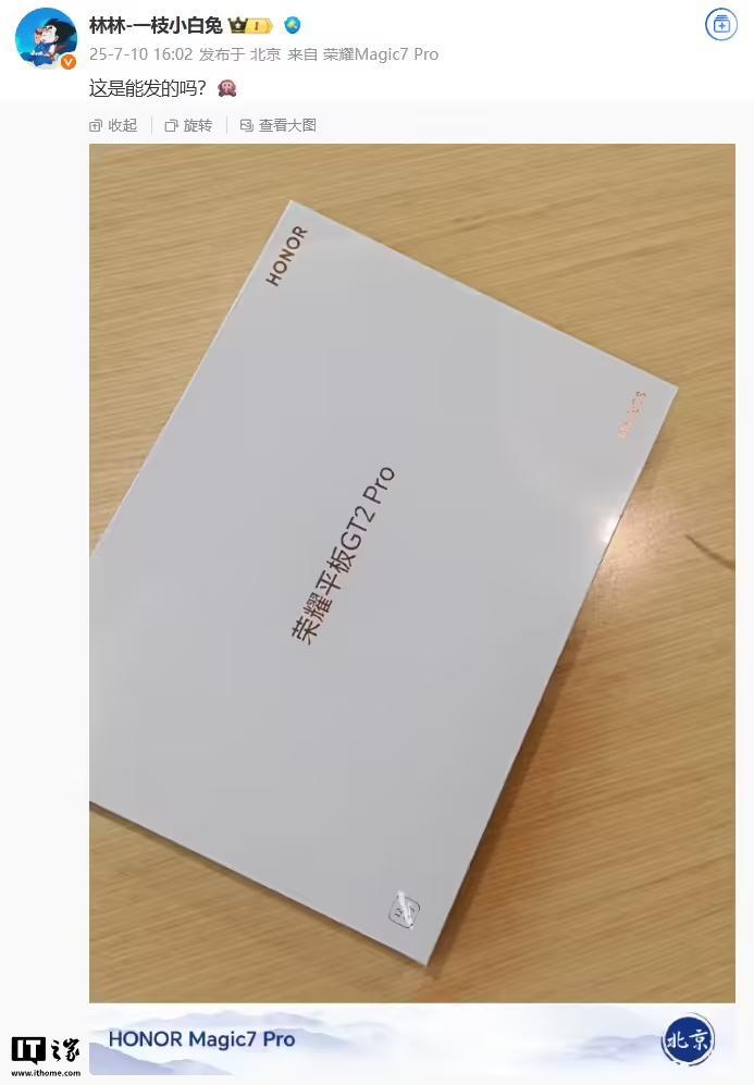 IT之家 7 月 10 日消息,荣耀中国区副总裁、智慧生活业务部部长林林今日在微博透露了一款平板新品 —— 荣耀平板 GT2 Pro,预计将在近期发布。
