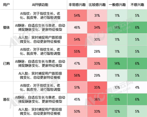 已购用户对“AI人脸识别”的兴趣度达56%,高于潜在用户6个百分点,显示技术成熟度已获得市场验证。