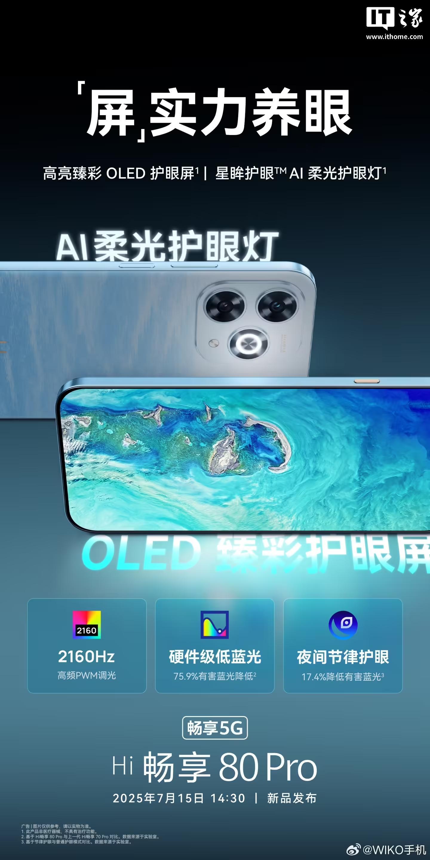 IT之家 7 月 13 日消息,WIKO 手机官方微博今日发文预热 Hi 畅享 80 Pro 手机。新机配备 OLED 臻彩护眼屏 + AI 柔光护眼灯,前者支持 2160Hz 高频 PWM 调光、硬件级低蓝光、夜间节律护眼。