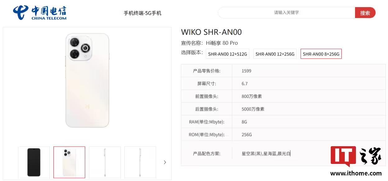 此外,型号为“SHR-AN00”的 WIKO Hi 畅享 80 Pro 手机已现身中国电信终端产品库。该机提供 8GB+256GB、12GB+256GB、12GB+512GB 三种存储规格,拥有星空黑(黑)、星海蓝、晨光白 3 种配色,产品零售价格 1599 元起。