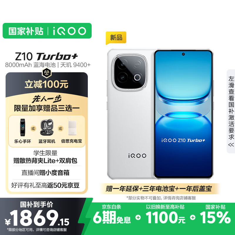 京东 vivo iQOO Z10 Turbo+ 12GB+256GB 云海白 天玑 9400 + 旗舰芯 8000mAh 超薄蓝海电池 国家补贴 电竞手机国补后 1869 元起直达链接