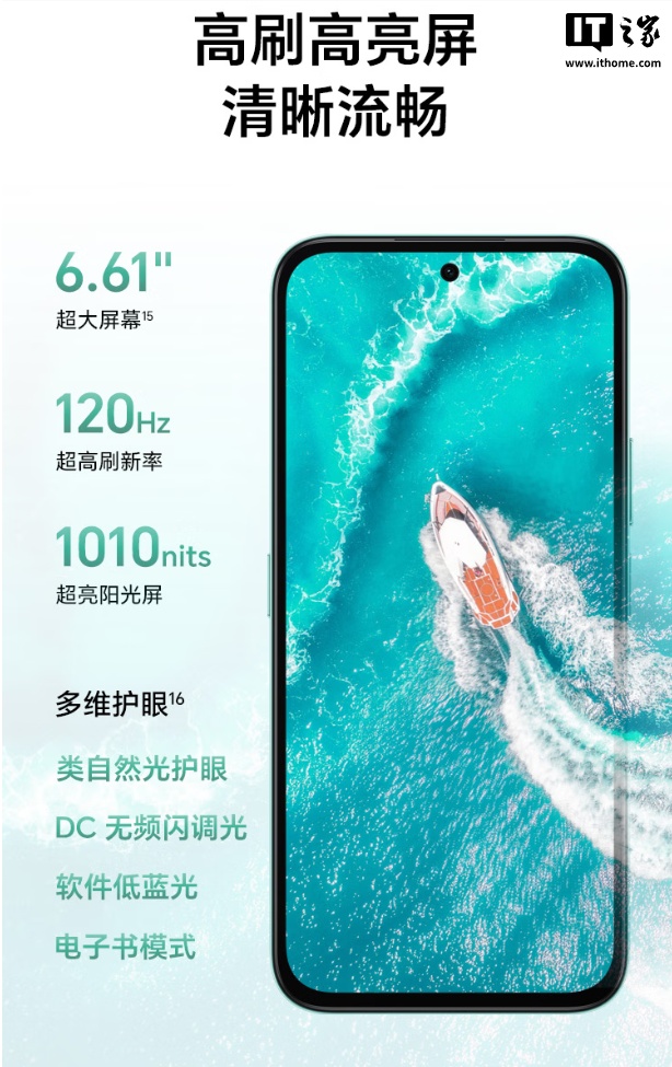 硬件方面,这款手机搭载联发科天玑 6300 处理器,支持 5G 通信,号称“三年持久流畅”,内置 6000mAh 电池,可连续通话 35 小时、刷 20 小时短视频;配有 6.61 英寸屏幕,支持 120Hz 高刷,最高亮度可达 1010 尼特。