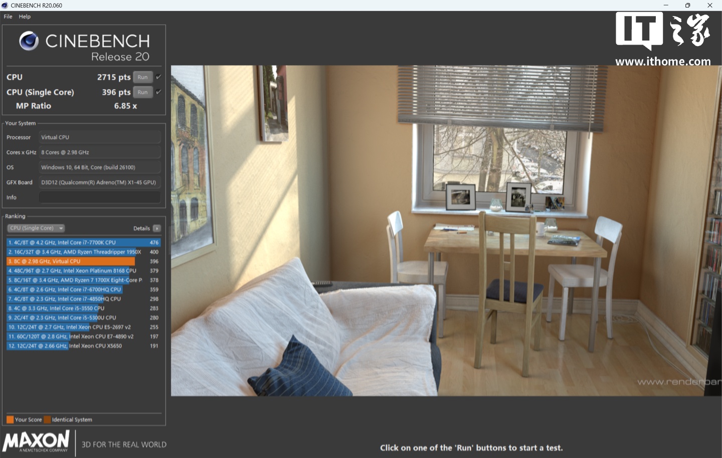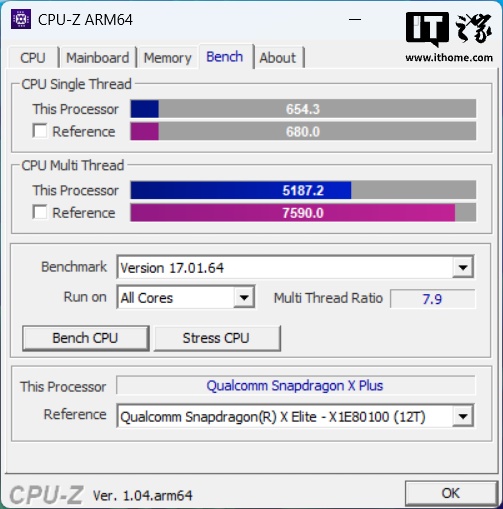 作为对比,IT之家实测的骁龙 X Elite(X1E-80-100、Surface Laptop 第 7 版 15 英寸)分数为 686.3、8140.3 分。