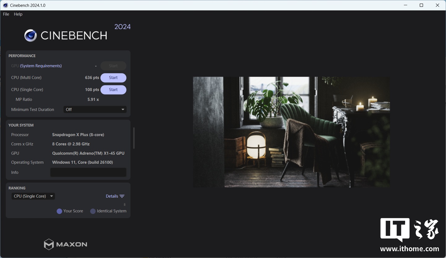 Cinebench 2024 同样已经原生适配 ARM 架构,在该项目中,Surface Laptop 13 英寸版单核 108pts、多核 636pts。