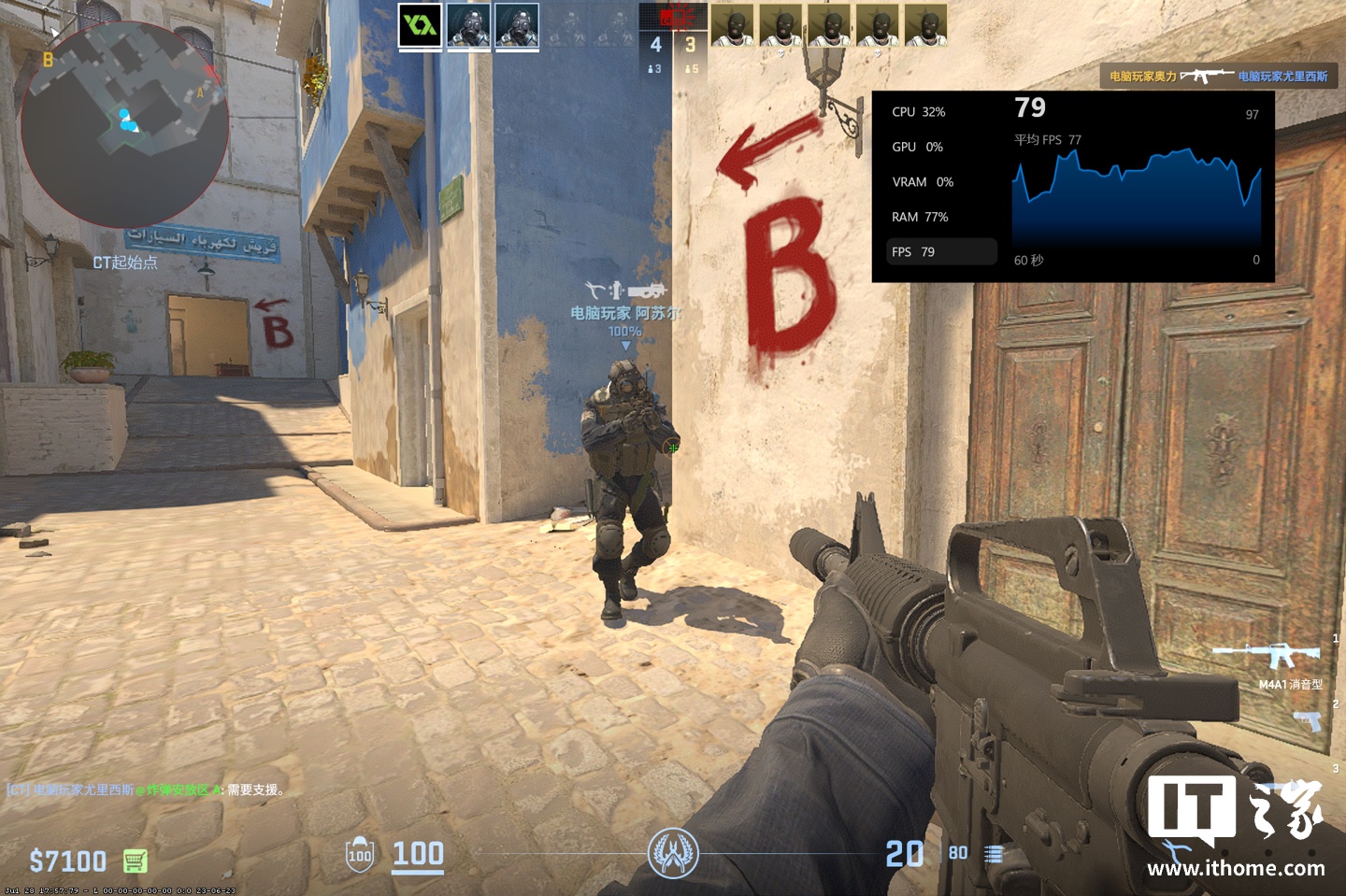 其实在测试前,笔者未抱过高期待,但实际结果却颇为惊喜:在原生分辨率、中低画质设置下,《CS2》游戏帧率能稳定在 50 帧之上,尽管游玩过程中会偶尔出现几秒钟的卡顿,但整体而言完全可以流畅运行,只是距离“玩得尽兴”还有些肉眼可见的差距。