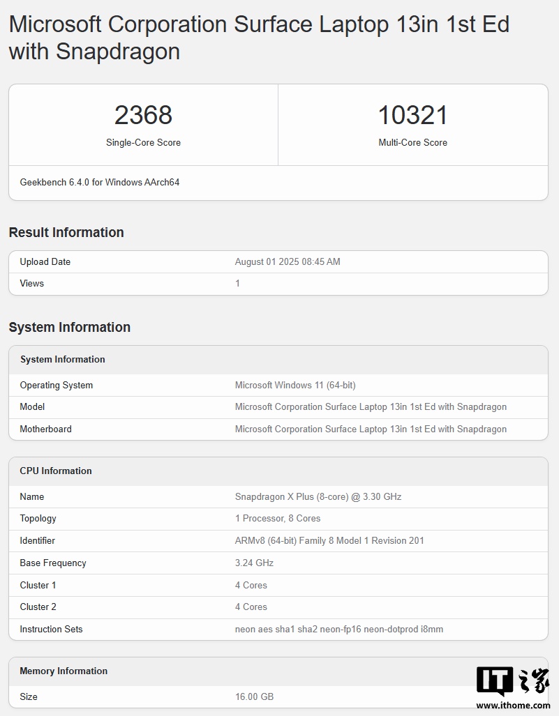Geekbench 6 测试中,Surface Laptop 13 英寸版单核心分数为 2368 分,多核心 10321 分。