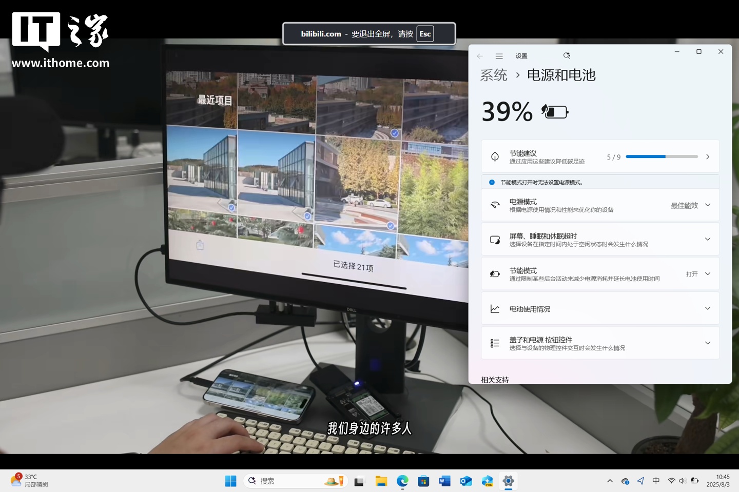 在满屏播放哔哩哔哩 1080P 视频的情况下,从晚上 21 点开始播放,一直到第二天 11 点,共计 14 个小时,此时电脑仍剩余约 39% 的电量,这一表现令人惊喜。