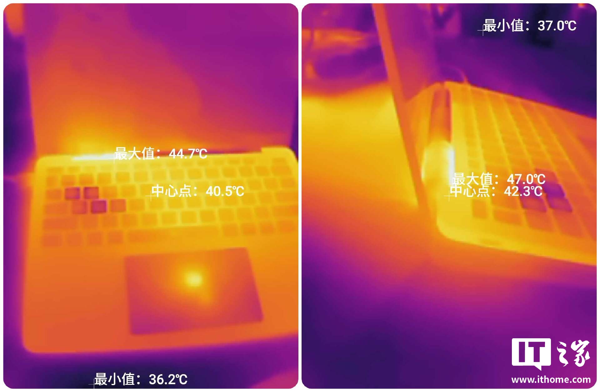 游戏过程中,我们开启了最高性能,尽管搭载的是骁龙 X Plus 处理器,但是依旧出现了发热的情况,实测最高温度 47°C 左右,热量主要集中在屏幕的转轴处,这也是机身唯一的散热孔。