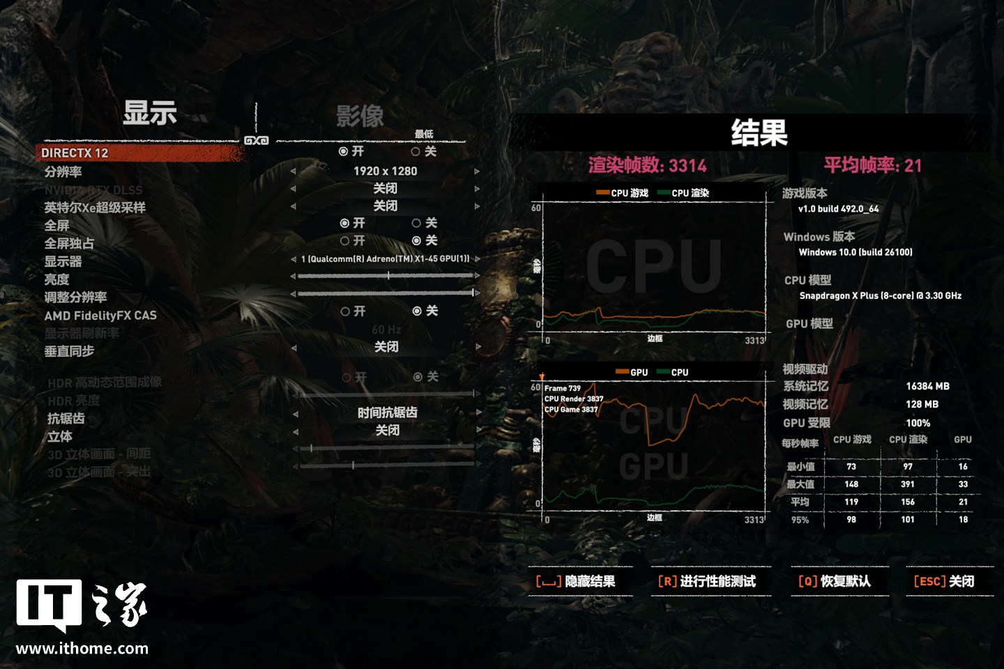 为进一步考验性能,我们选用《古墓丽影:暗影》的自带基准测试,在默认低画质下测得仅为 21 帧。