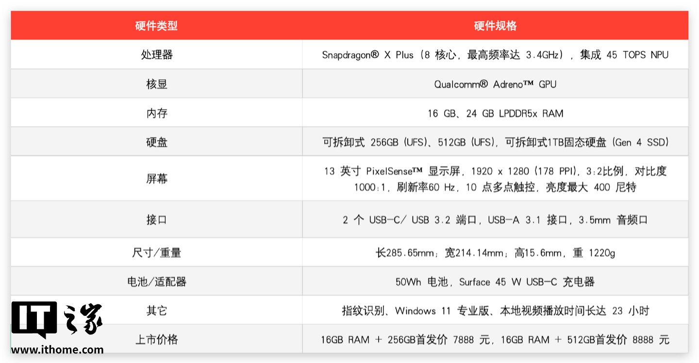 微软 Surface Laptop 13 英寸版搭载了高通骁龙 X Plus 芯片(8 核),最高主频 3.4 GHz,集成 45 TOPS NPU,性能较 Surface Laptop 5 提升高达 50%。