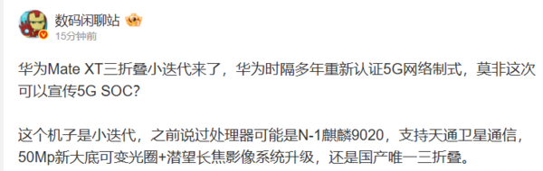 【CNMO科技消息】7月17日,有数码博主爆料称,华为将在下半年推出Mate XT三折叠手机的小迭代版本,搭载麒麟9020处理器。