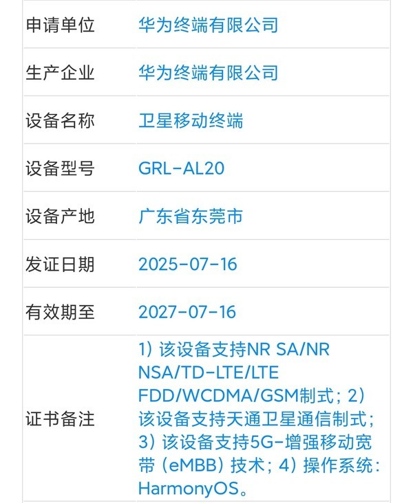 根据认证信息,新机型号为GRL-AL20,由华为终端有限公司生产,已于7月16日获得认证,有效期至2027年。值得注意的是,该设备明确标注支持5G NR SA/NSA网络制式,博主表示,这是华为时隔多年后重新在认证信息中公开提及5G网络支持。此外,新机还支持5G增强移动宽带(eMBB)技术,进一步强化网络性能。