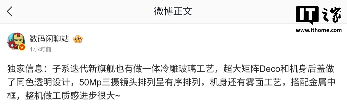 据博主介绍,这款机器用上了“一体冷雕玻璃工艺”,超大矩阵 Deco 和机身后盖做了“同色透明设计”,5000 万像素三摄镜头“呈有序排列”,机身具备雾面工艺,搭配金属中框,“整机做工质感进步很大”。