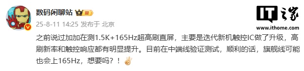IT之家 8 月 11 日消息,博主 @数码闲聊站 今日爆料称,一加在测试 1.5K+165Hz 超高刷直屏,主要是迭代新机触控 IC 做了升级。
