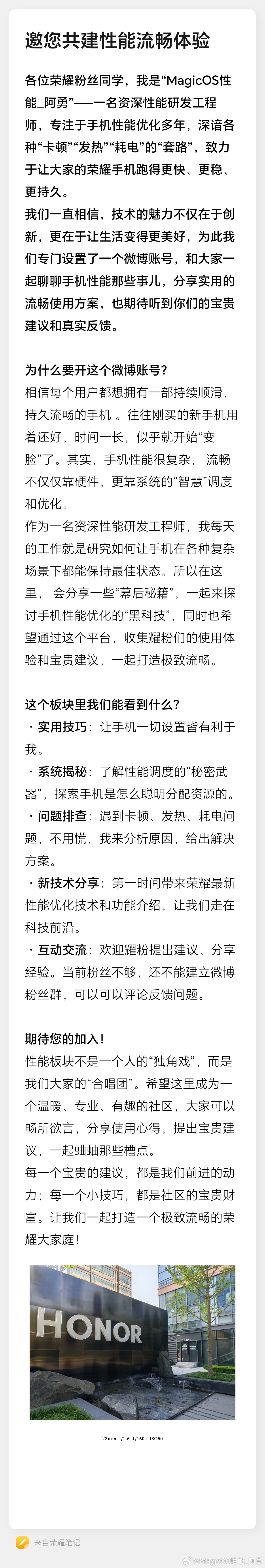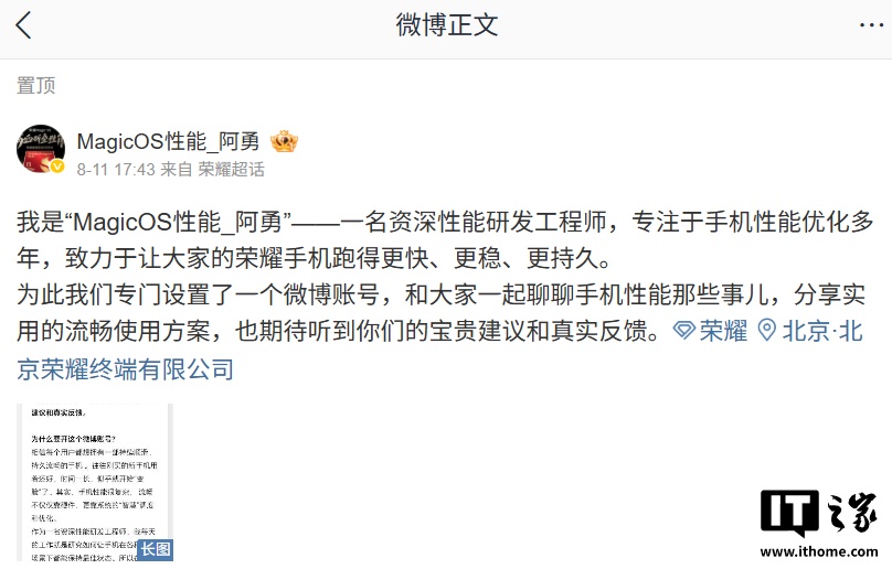 IT之家 8 月 12 日消息,荣耀手机性能优化工程师 @MagicOS性能_阿勇 昨日官宣入驻微博,用于分享实用的流畅使用方案、以及倾听用户建议和真实反馈。