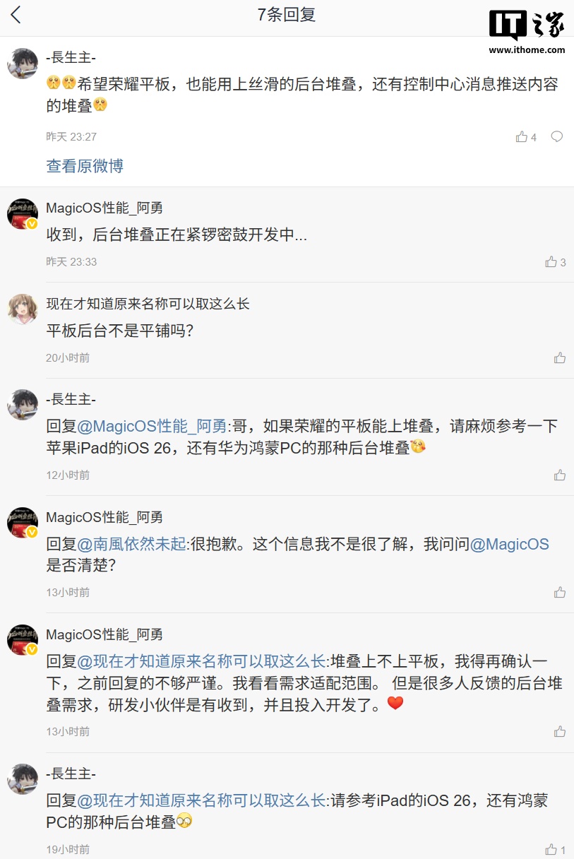 IT之家注意到,该荣耀手机性能优化工程师在自己的微博中回复了部分网友的问题,针对 MagicOS 系统后续是否会支持「后台堆叠」效果,他明确表示“正在紧锣密鼓开发中”,但该效果尚不知晓是否会适配平板。