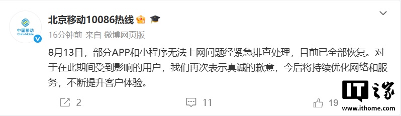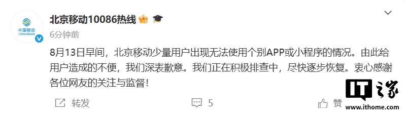 对此,北京移动刚刚在官微回应称:“8 月 13 日早间,北京移动少量用户出现无法使用个别 App 或小程序的情况。由此给用户造成的不便,我们深表歉意。我们正在积极排查中,尽快逐步恢复。”