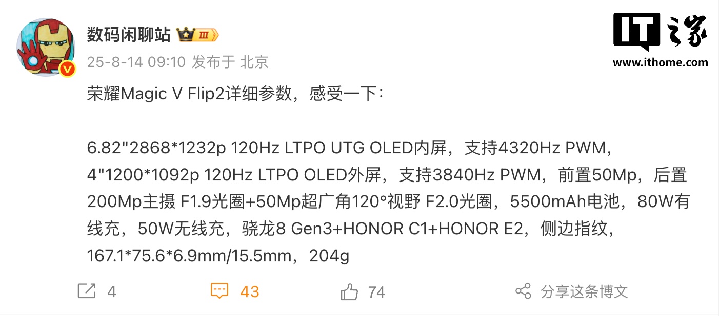 IT之家 8 月 14 日消息,@数码闲聊站 今天放出了荣耀 Magic V Flip2 的详细参数信息,包括屏幕、影像、性能、电池等多方面。