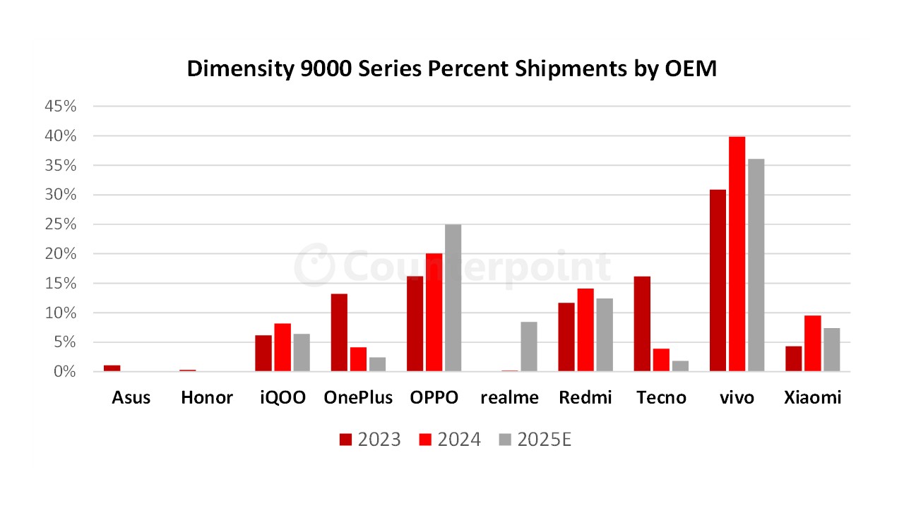 在品牌方面,天玑 9400 芯片主要由 OPPO 和 vivo 两家手机厂商主导适配;而天玑 9300 芯片主要由 iQOO、OPPO、REDMI 和 vivo 共同推动,主要搭载机型包括 vivo X200 Pro、OPPO Find X8 系列、iQOO Neo 10 Pro 及 REDMI K80 Ultra。