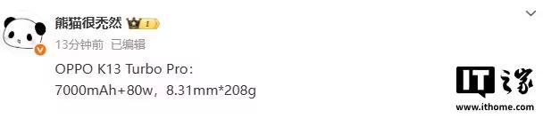 IT之家 7 月 19 日消息,据博主 @熊猫很禿然 今日爆料,OPPO K13 Turbo Pro 手机配备 7000mAh 电池 + 80W 快充,机身厚度为 8.31mm,重量为 208g。