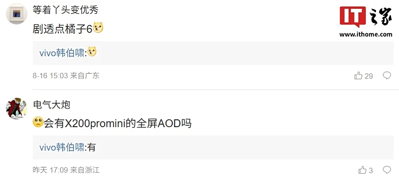 IT之家注意到,韩伯啸还在评论区回复了部分网友的问题:有用户希望他透露“橘子 6”的信息(即 OriginOS 6 系统),他回复“