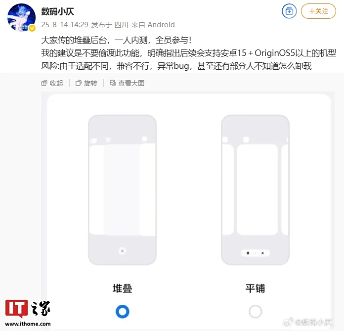 目前,vivo OriginOS 系统支持后台堆叠功能的系统应用安装包已在各平台流传(vivo X Fold5 已更新支持),安装后即可实现后台应用的卡片堆叠效果。需要注意的是目前安装该应用后,会存在卡顿等异常 BUG。