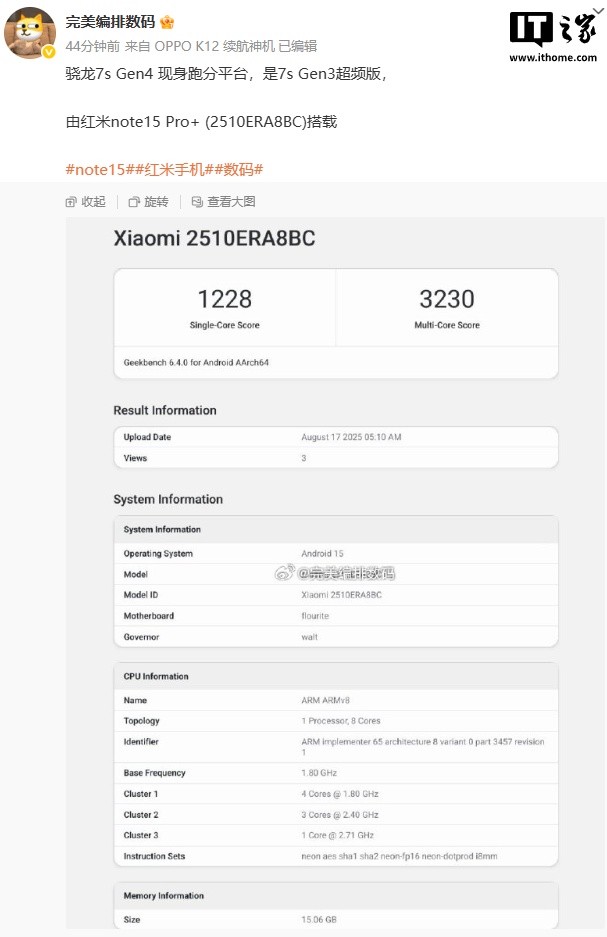 IT之家 8 月 17 日消息,今日,一款型号为 2510ERA8BC 的小米新机现身跑分平台 Geekbench,博主 @完美编排数码 透露为小米 REDMI Note15 Pro+。