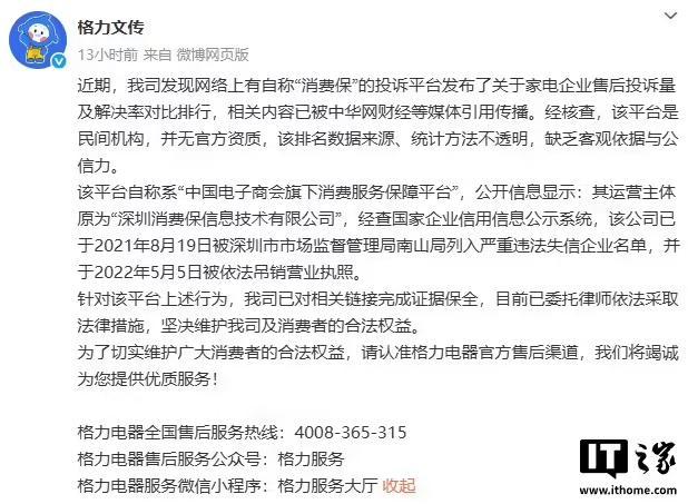 IT之家 7 月 20 日消息,昨晚,格力官方微博 @格力文传 发文称:“近期,我司发现网络上有自称“消费保”的投诉平台发布了关于家电企业售后投诉量及解决率对比排行,相关内容已被中华网财经等媒体引用传播。经核查,该平台是民间机构,并无官方资质,该排名数据来源、统计方法不透明,缺乏客观依据与公信力。”