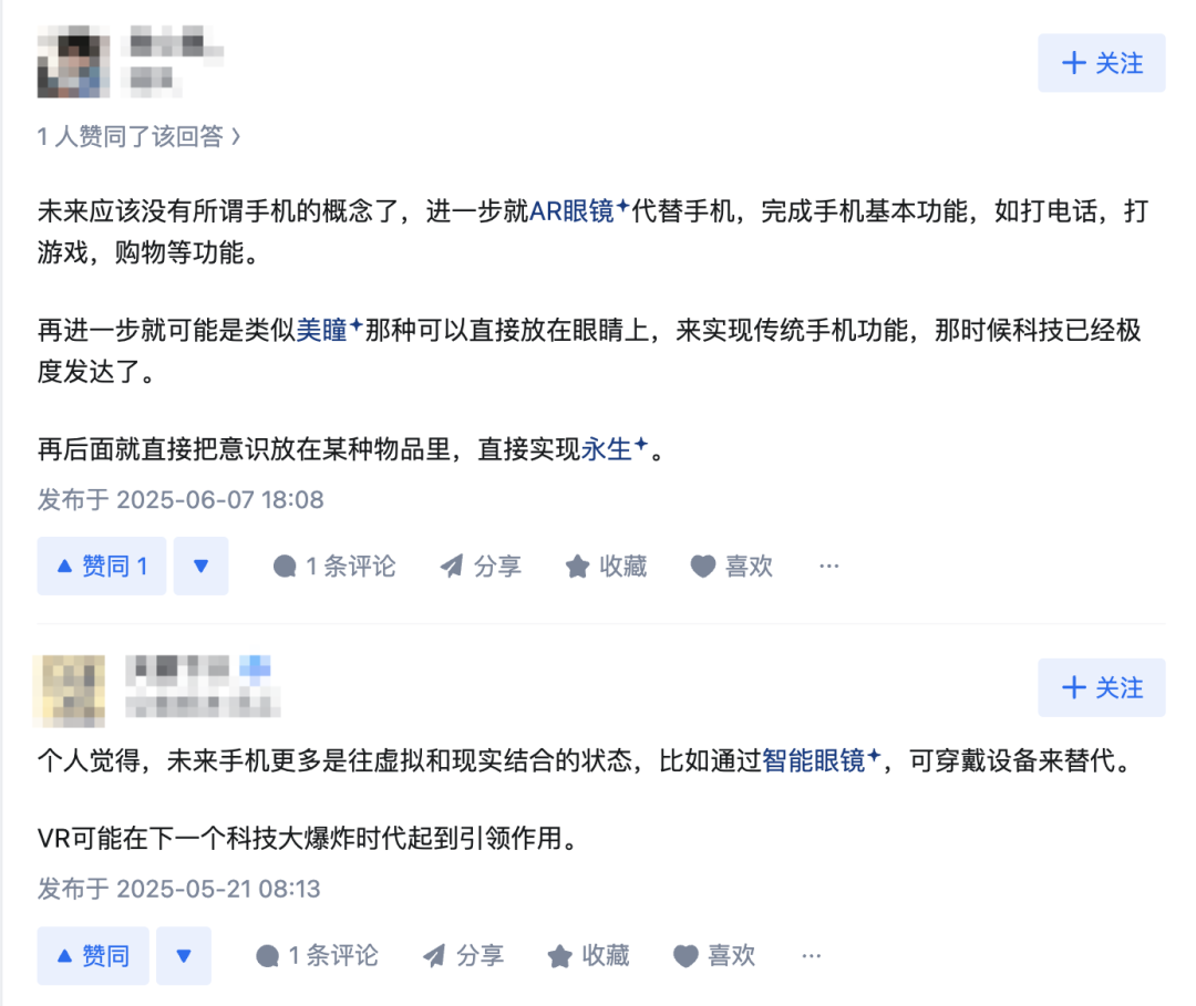 在知乎平台,网友们也曾就手机会有什么新形态展开讨论,但大多数网友认为手机的形态已经发展到了极致,未来取代手机的可能是智能眼镜、植入式设备。