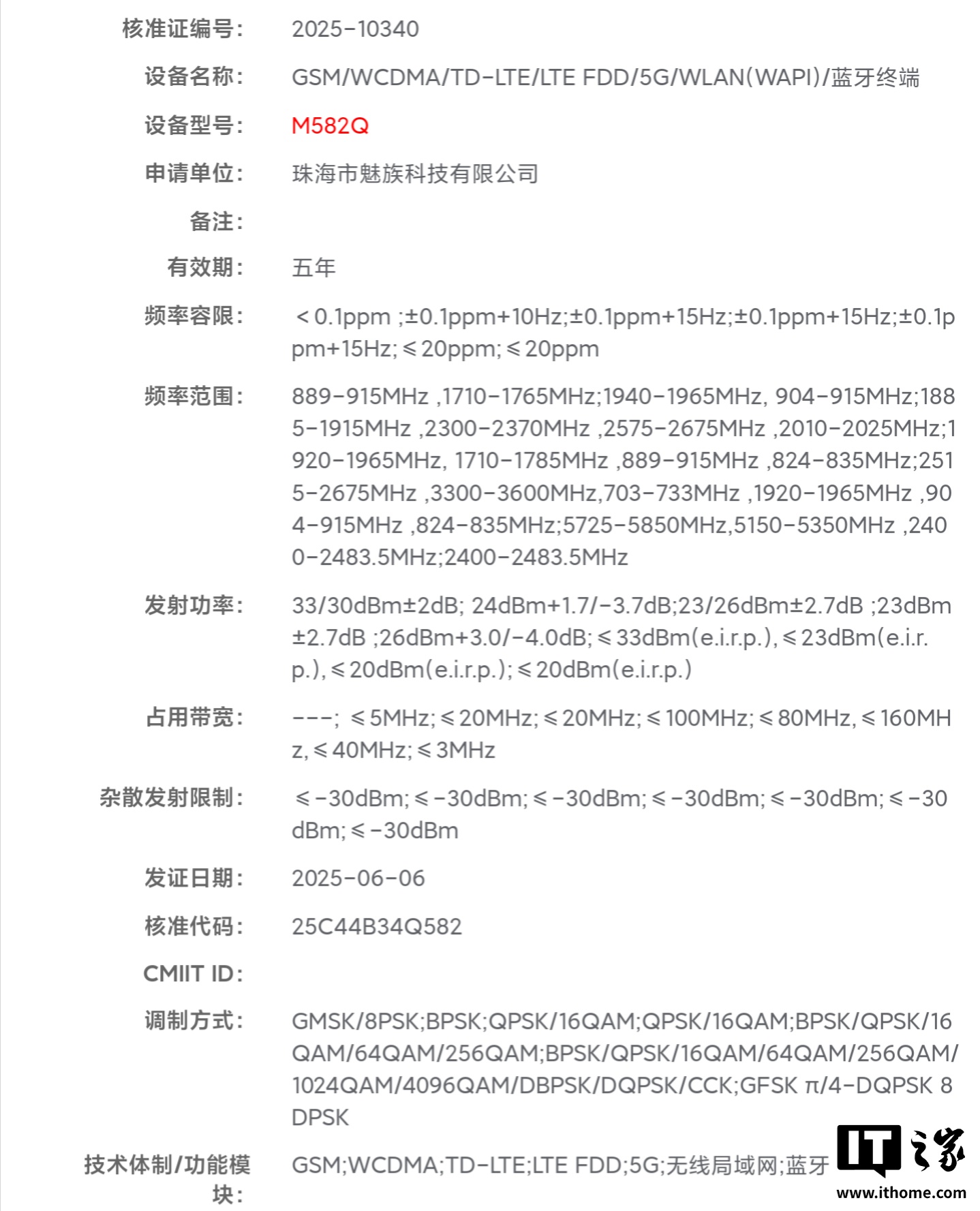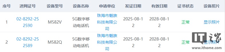 IT之家查询工信部入网认证网站后发现,魅族有两款 5G 新机在 8 月 12 日通过了工信部入网认证获公示,型号分别为 M582V、M582Q。