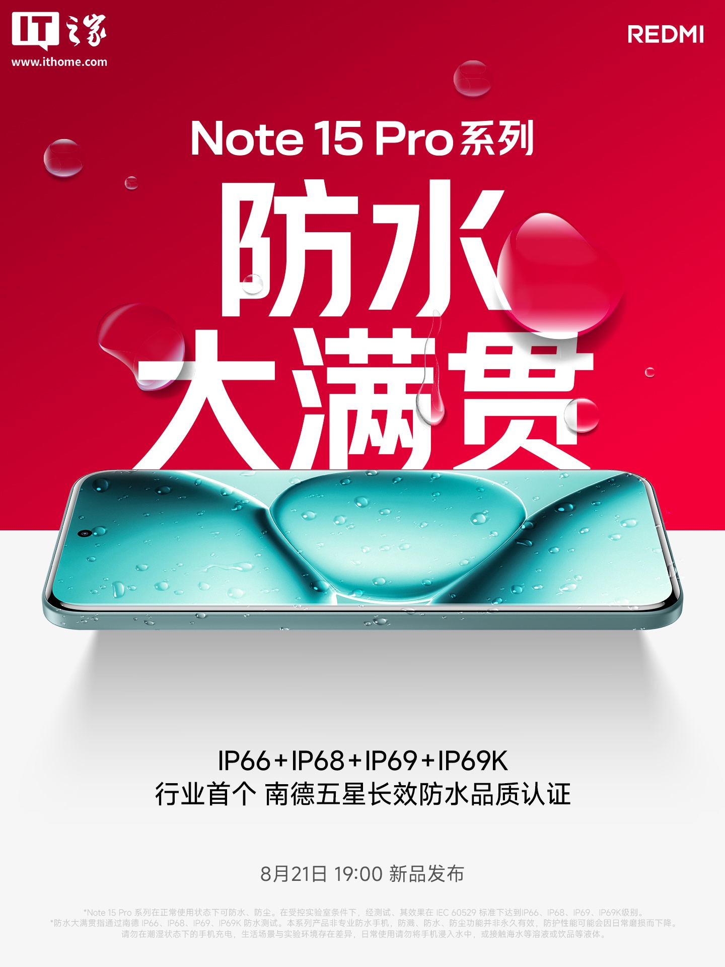 IT之家 8 月 18 日消息,REDMI Note 15 Pro 系列手机将于 8 月 21 日正式发布,新机以“真抗摔、真防水、长续航”为卖点,旨在为用户提供更加耐用和可靠的使用体验。