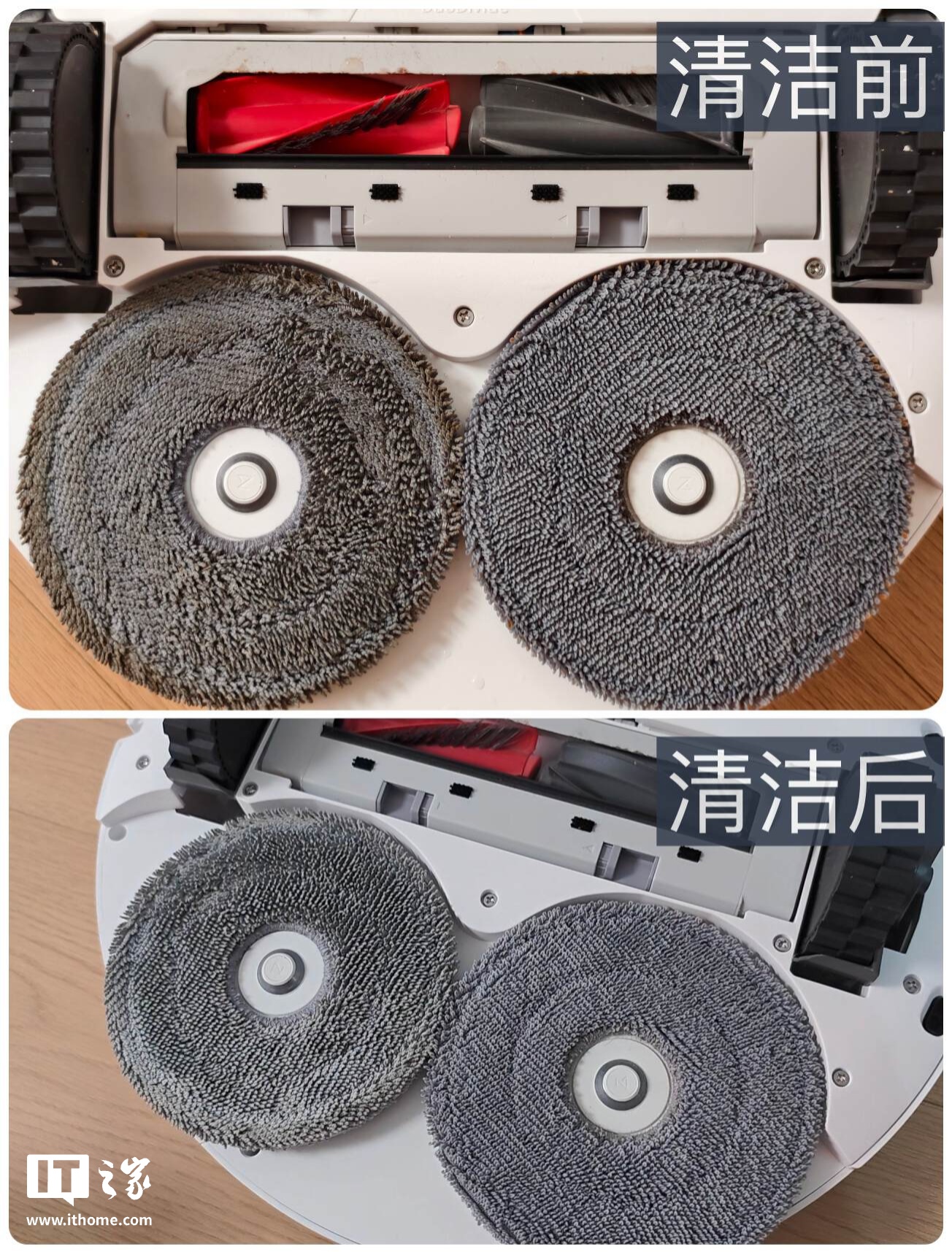 另外,也可以看看拖布清洁前后的对比图:清洁前的拖布沾着污渍,经过自清洁后,拖布上的污渍被洗净,自清洁的效果一眼就能看出来。