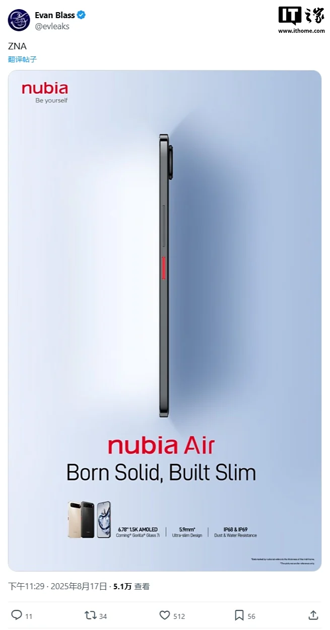 IT之家 8 月 19 日消息,消息源 @evleaks 昨日(8 月 18 日)在 X 平台发布系列推文,分享了一组宣传图,展示了努比亚(Nubia)即将推出的全新超薄手机 Nubia Air,曝光了该机多角度渲染图与详细硬件参数。