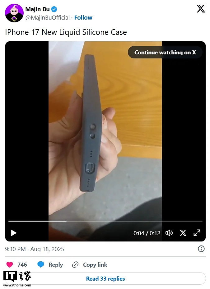 IT之家 8 月 19 日消息,据数码爆料人“Majin Bu”透露,苹果公司可能将为 iPhone 17 系列推出一款名为“液态硅胶”的手机壳。该爆料人今日在社交平台 X 上分享了一段简短视频,展示了一款看似为 iPhone 17 标准版模型机的硅胶手机壳。从视频中可以看到,该手机壳底部左右两侧分别设有两个小孔,用于连接挂绳,而挂绳很可能会由第三方品牌单独销售。有了挂绳,用户在拍照等场景下可以将 iPhone 固定在手腕上,方便使用。