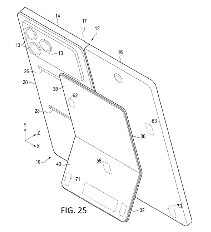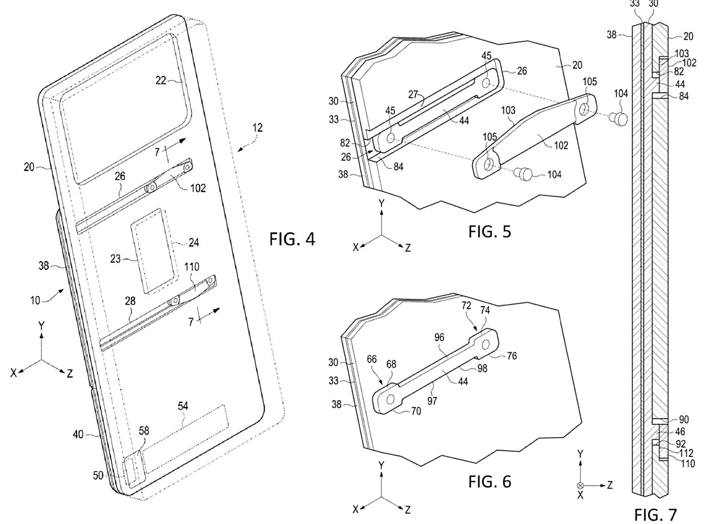 专利文件描述,这款折叠手机由两个屏幕组成,第二块屏幕背部集成了支架模块。支架采用了类似 Surface Pro 的金属结构,通过上板和下板的铰链连接,用户只需用拇指推动上板,即可展开支架,让设备稳稳立于桌面。