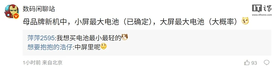后续博主还在评论区补充:“母品牌新机中,小屏最大电池(已确定),大屏最大电池(大概率)