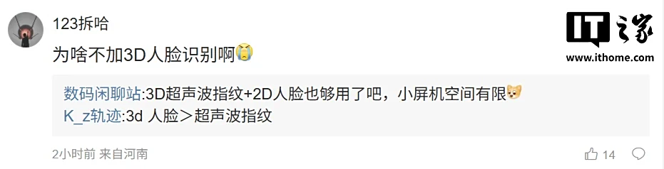 ”,博主回复道:“3D 超声波指纹 + 2D 人脸也够用了吧,小屏机空间有限
