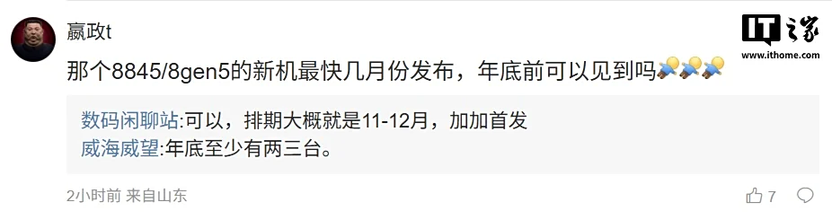 ”;另一位用户则询问道:“那个 8845/8gen5 的新机最快几月份发布,年底前可以见到吗”,博主则回复道:“可以,排期大概就是 11-12 月,加加首发”。