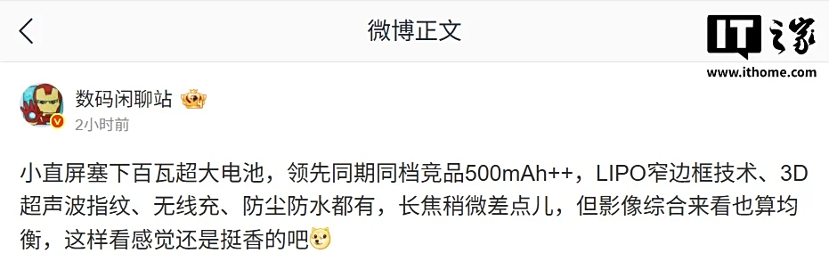 博主表示,这台手机的电池容量将“领先同期同档竞品 500mAh++”,具备 LIPO 窄边框技术、3D 超声波指纹、无线充、防尘防水,长焦镜头“稍微差点儿”,但影像能力“综合来看也算均衡”,博主认为“这样看感觉还是挺香的吧”。