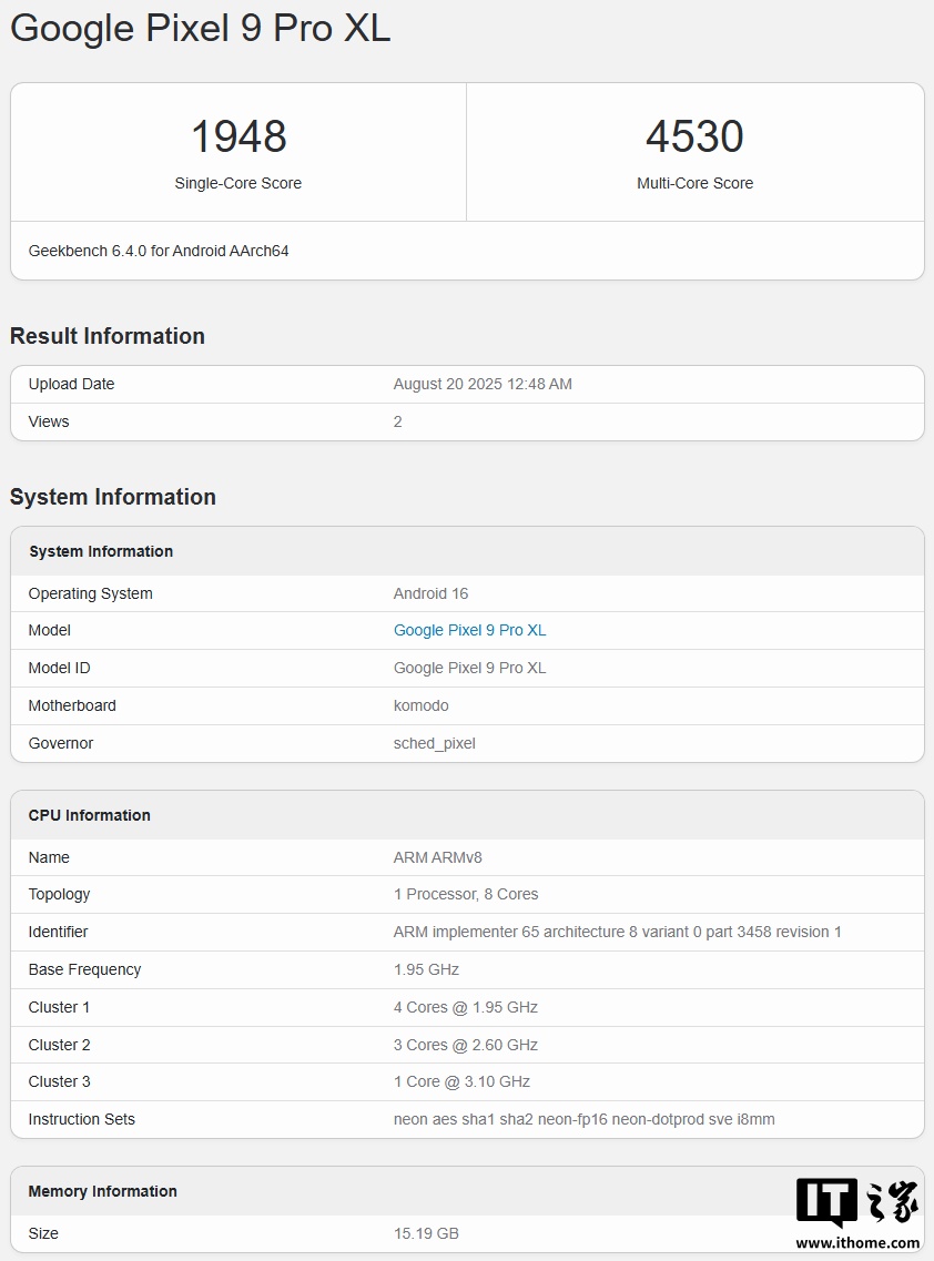 作为对比,同样挑选 8 月 20 日 Pixel 9 Pro XL 手机在 GeekBench 6.4.0 版本的得分,最高一条记录为单核 1948 分,多核 4530 分。