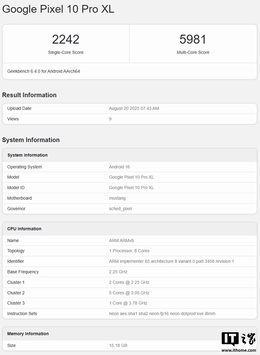 IT之家查询 GeekBench 跑分库,8 月 20 日谷歌 Pixel 10 Pro XL 手机共有 8 条记录,为公平对比 Pixel 9 Pro XL 手机,剔除 6.3.0 版本(得分更高,单核 2329 分、多核 6358 分),挑选最高得分为单核为 2242 分,多核 5981 分。