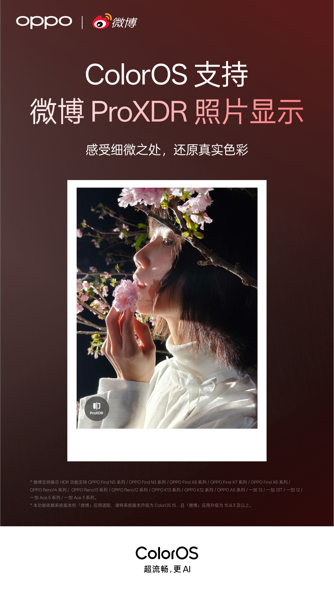 据介绍,OPPO Find N5 系列 / OPPO Find N3 系列 / OPPO Find X8 系列 / OPPO Find X7 系列 /OPPO Find X6 系列 / OPPO Reno14 系列 / OPPO Reno13 系列 /OPPO Reno12 系列 /OPPO K13 系列 / OPPO K12 系列 / OPPO A5 系列 / 一加 13T / 一加 13 / 一加 12 / 一加 Ace5 系列 / 一加 Ace3 系列将陆续支持微博 ProXDR 照片显示功能。